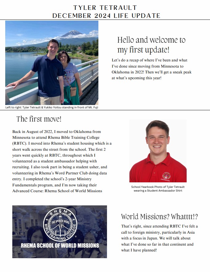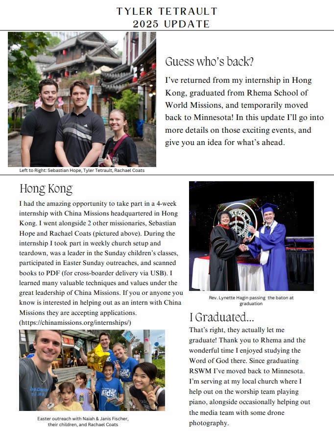 This year’s newsletter is full of exciting milestones! Tyler shares about completing his internship with China Missions in Hong Kong, graduating from Rhema School of World Missions, and returning to Minnesota to serve at his home church while preparing for long-term ministry in Japan.
